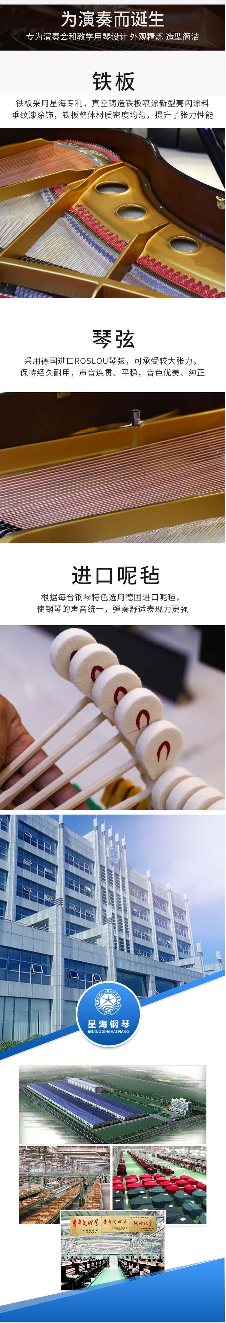 鐵  板:鋼板采用真空鑄造技術(shù),抗張力性能提高,其棱角清晰,表面細(xì)膩,噴涂了星海新型亮閃涂料,凸顯了金屬質(zhì)感,根據(jù)鋼琴發(fā)聲原理進(jìn)行的結(jié)構(gòu)設(shè)計(jì),提高了三個(gè)音區(qū)的協(xié)振性能。